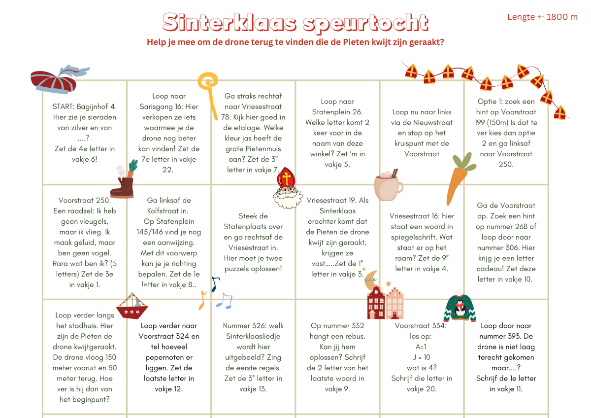 De ondernemers in de binnenstad hebben weer een leuke Sinterklaas speurtocht opgezet voor de kinderen. Op verschillende plekken in de binnenstad kunnen de kinderen raadsels en vragen oplossen.