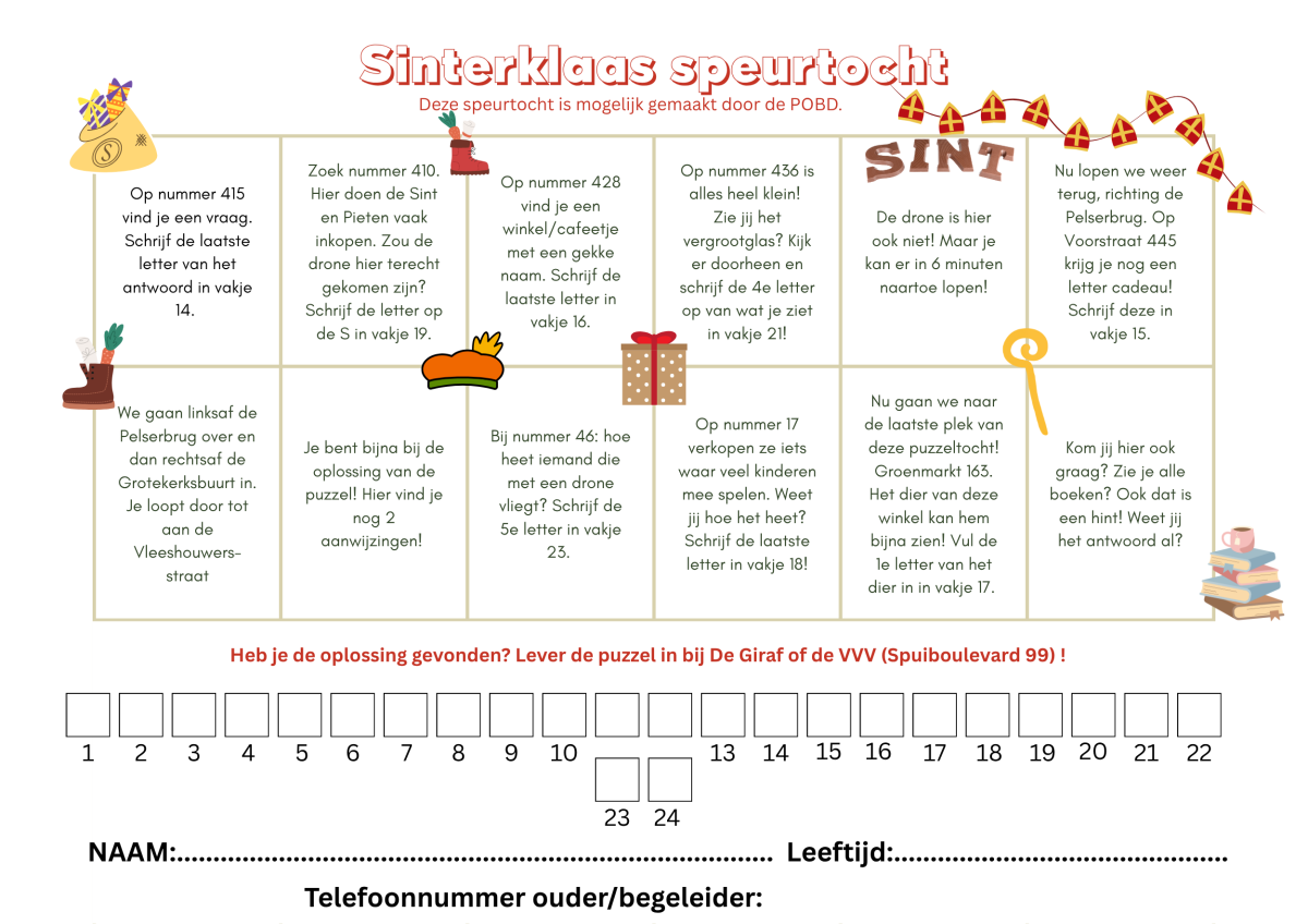 De speurtochten worden uitgedeeld bij de intocht en zijn verkrijgbaar bij Kinderboekwinkel De Giraf, Juffrouw Pollewop, Halte 13, Mees Home & Concept Store en VVV Dordrecht. Inleveren kan bij De Giraf en de VVV. Misschien win jij één van de cadeautjes! Voor de kleinste kinderen is er een kleurplaat.