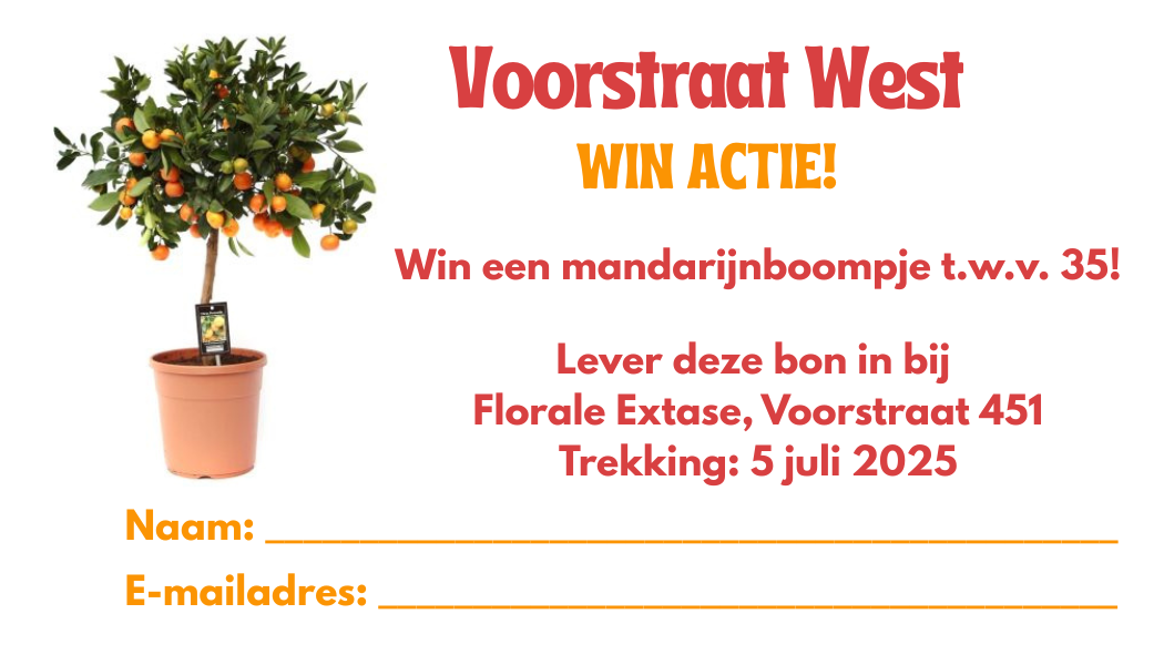 Op de Voorstraat west maak je de komende tijd elke week kans op een leuke prijs van één van de winkels. Elke keer als je iets koopt bij één van de deelnemende winkels maak je kans! Deze week kan je een gewild mandarijn- of citroenboompje winnen van Florale Extase. Zo geef je je terras, tuin of balkon direct een heerlijk mediterraans tintje.